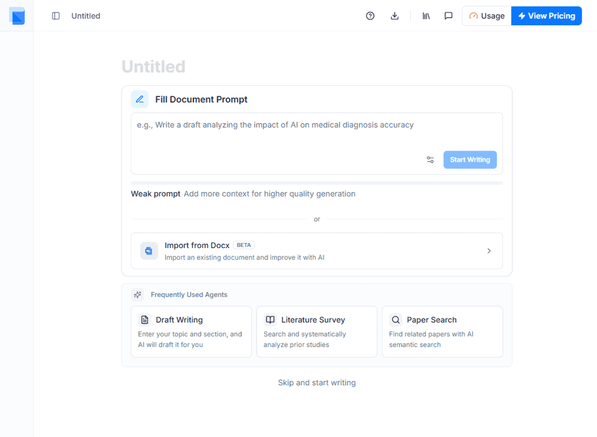 创建新文档时会出现用提示词开始界面。请输入研究主题。