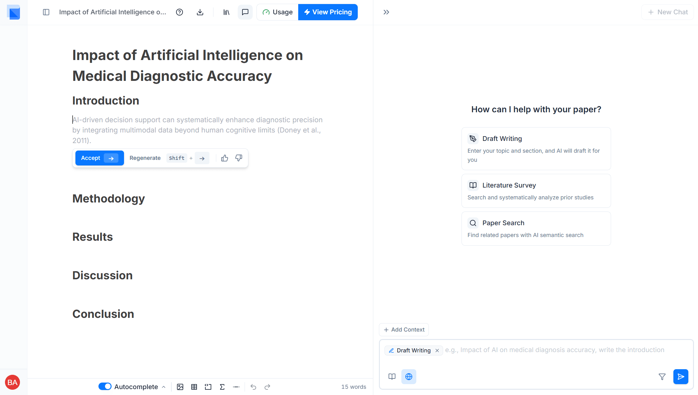提交提示词后,基本论文结构和自动补全设置即完成。在编辑器中将光标停留,自动补全会建议下一句。要撰写结构完整的长草稿,可在右侧AI聊天面板使用草稿撰写助手按章节撰写。